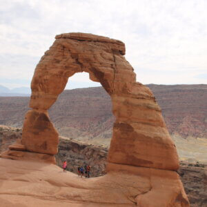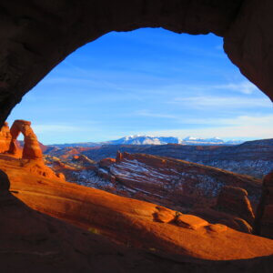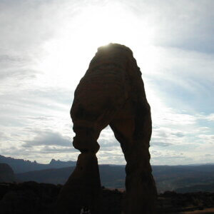 アーチーズ国立公園内にとどまらず、ユタ州のシンボルとさえ呼ばれるのがデリケートアーチです。アーチの前は深いすり鉢状の谷になっていて気を付ける必要があります。ここを訪れるなら圧倒的に夕方。美しい光線に包まれる神殿のような姿を楽しむことが出来ます。
