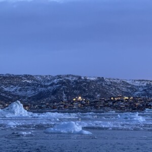 イルリサット最大の楽しみはアイスフィヨルドクルーズでしょう。巨大で真っ青な氷山の間を縫うように小型の船からのクルーズでその絶景を楽しみます。2025年12月には時々猟師がアザラシを狙って放つ銃砲が氷山の海に響き渡っていました。極北に暮らす人々の生活を感じる瞬間でした