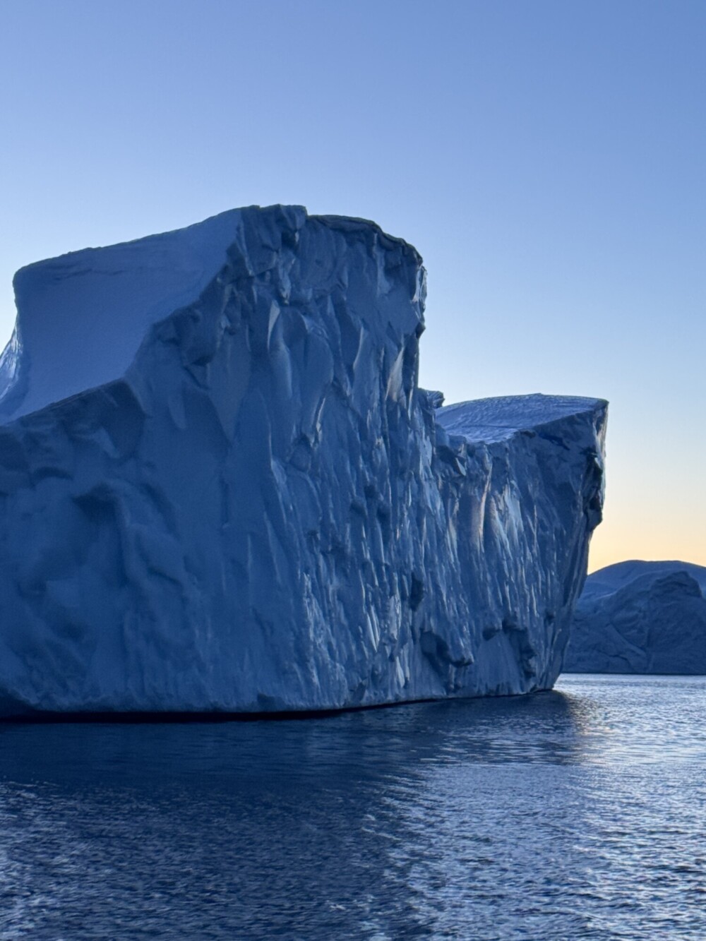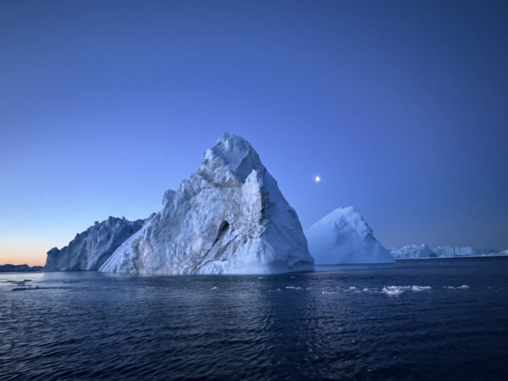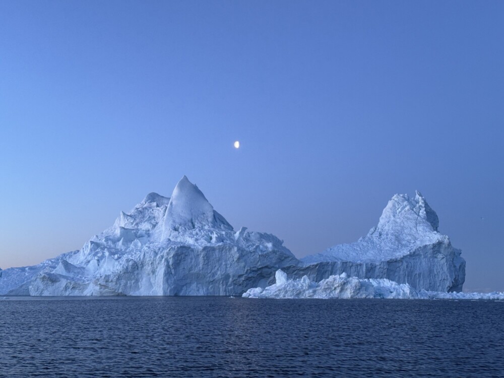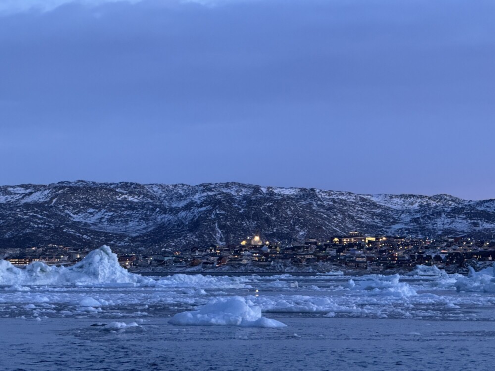 イルリサット最大の楽しみはアイスフィヨルドクルーズでしょう。巨大で真っ青な氷山の間を縫うように小型の船からのクルーズでその絶景を楽しみます。2025年12月には時々猟師がアザラシを狙って放つ銃砲が氷山の海に響き渡っていました。極北に暮らす人々の生活を感じる瞬間でした