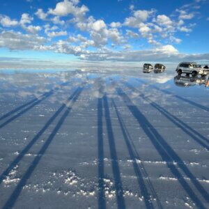 日中は、天空の鏡に雲を映して写真を撮り、塩砂漠を4WDで走り抜ける。夕暮時は、真っ赤に染まっていく空に感動、真夜中の星が降り注ぐ夜空に見とれ、日本では目に出来ない南十字星を眺める。