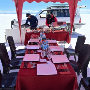 巨大なウユニ塩湖を満喫するために、昼食を食べにホテルや街に戻ることは時間の無駄です。そこでこのツアーではウユニ塩湖の中の風景の良い場所でビュッフェランチを楽しみます。もとから美味しい食事が素晴らしい風景でさらに美味しく感じます。