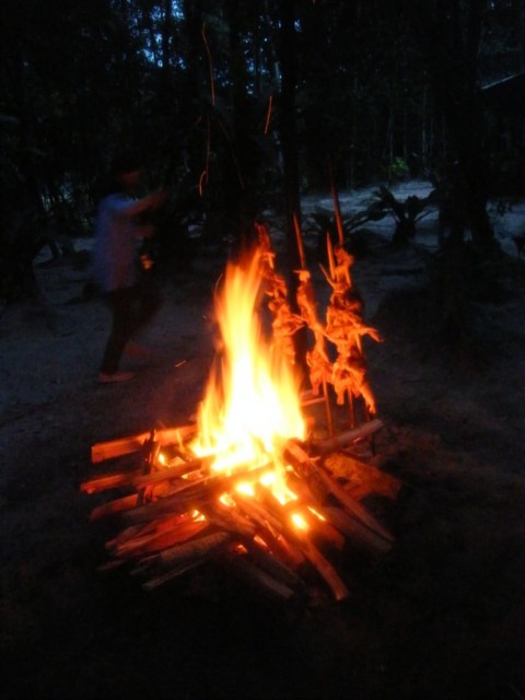 ⾷事はキャンプファイヤーのように⽊を組み、そこで鶏⾁を焼いてくれます。