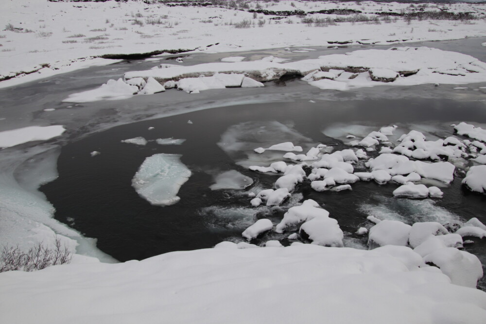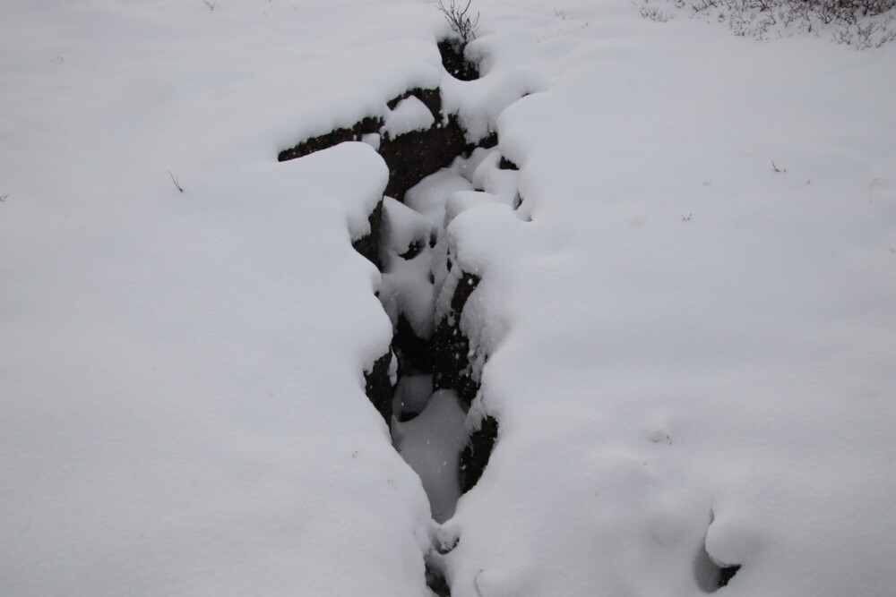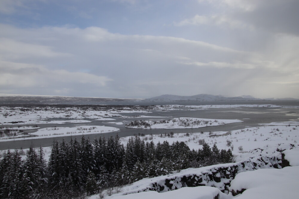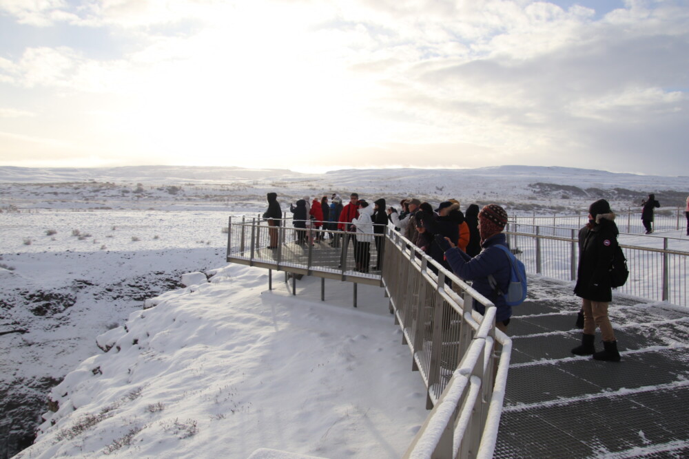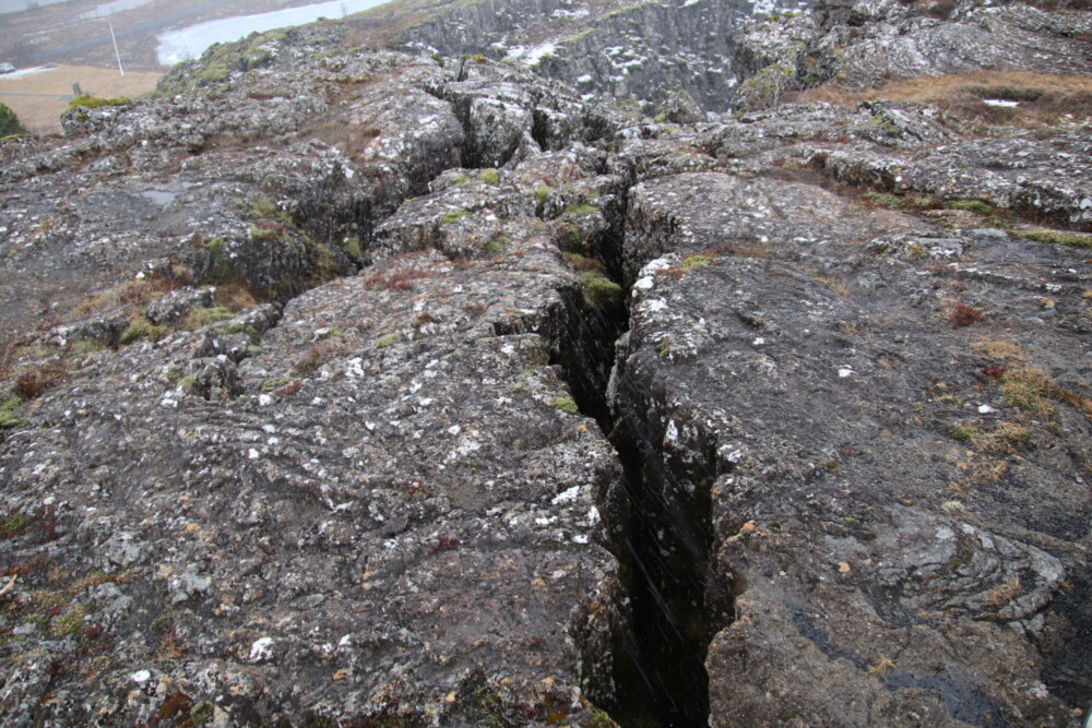そして世界的にも有名な地球の割れ目ギャウもあります。地球上で2か所しかない海嶺が地上に乗り出している場所(もう1か所はアフリカ大陸)であり、そのため地球の割れ目と呼ばれています。西側に北アメリカプレート、東側にユーラシアプレートがありその間を歩くことになるのですが、最初は自分の歩いている場所が割れ目の1つだとは思わないかもしれません。私も実際に歩いてみて本当に今割れ目を歩いているのかと疑いたくなりました(笑)。それくらい大きな割れ目になっています。今でも年に2,3センチずつ広がっているそうです。そして勘違いしがちなポイントとして挙げられるのが、ギャウは1つではないということ。実際に歩く場所ももちろん大きなギャウの1つなのですが、展望台に行くと小さなギャウがたくさんあることが目で見てわかります。さらに展望台からはアイスランド首相のサマーハウスや教会、夏に潜って底の亀裂を見ることができるシンクヴァトラヴァトン湖が見えます。