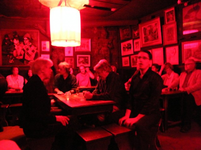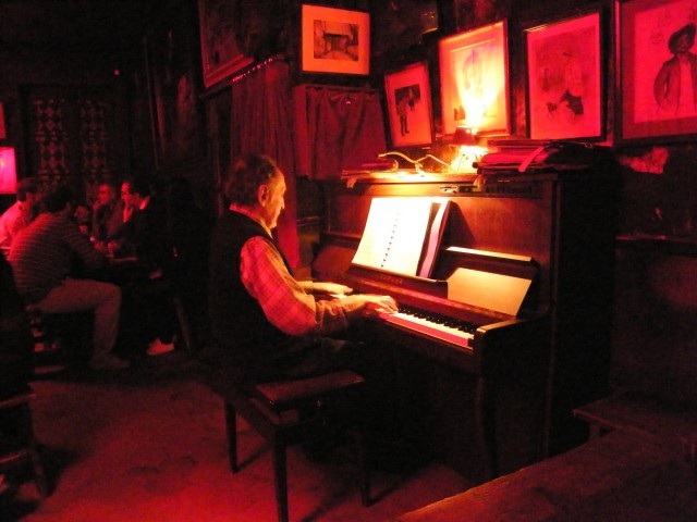 店内では食事もダンスもなく、あるのは一杯のアルコールの果実酒とシャンソンのみです。赤い光に包まれた狭いホールの中心にはテーブルが置かれ、夜も更けた9時を過ぎた頃になるとプロのシャンソン歌手がテーブルに座り、ピアノとアコーディオンの生演奏をバックに歌い始めます。その周りを客が囲んで聞き入ったり、一緒に歌ったり、夜中過ぎまでそれは続きます。