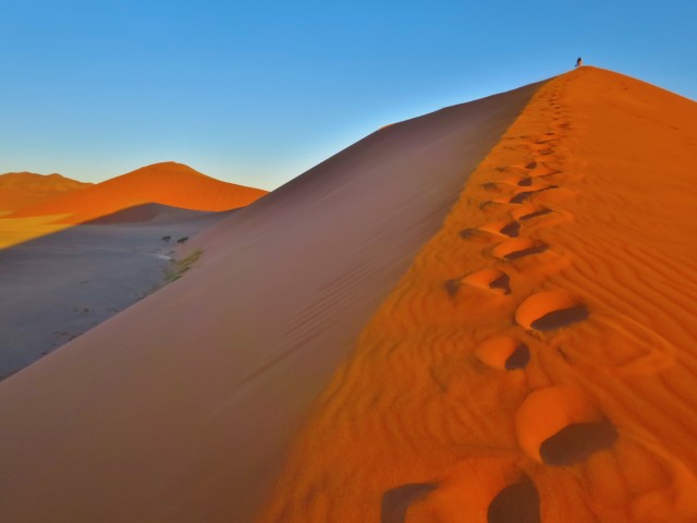 ナミブ砂漠は時間帯によって景⾊を楽しむことができ、⼣焼けや朝焼けに染まる砂漠が幻想的です。