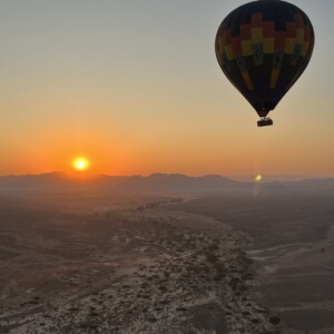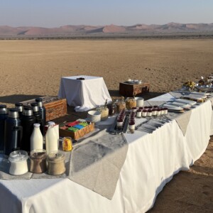 遊覧飛行で楽しいのはバルーンサファリですね。ゆったりとした速度で空から砂漠の風景を楽しめます。朝陽が登るタイミングに合わせて楽しみますから素晴らしい砂漠の陰影も楽しめますよ。バルーンサファリの後は砂漠の中での朝食。朝からスパークリングワインも楽しめます。